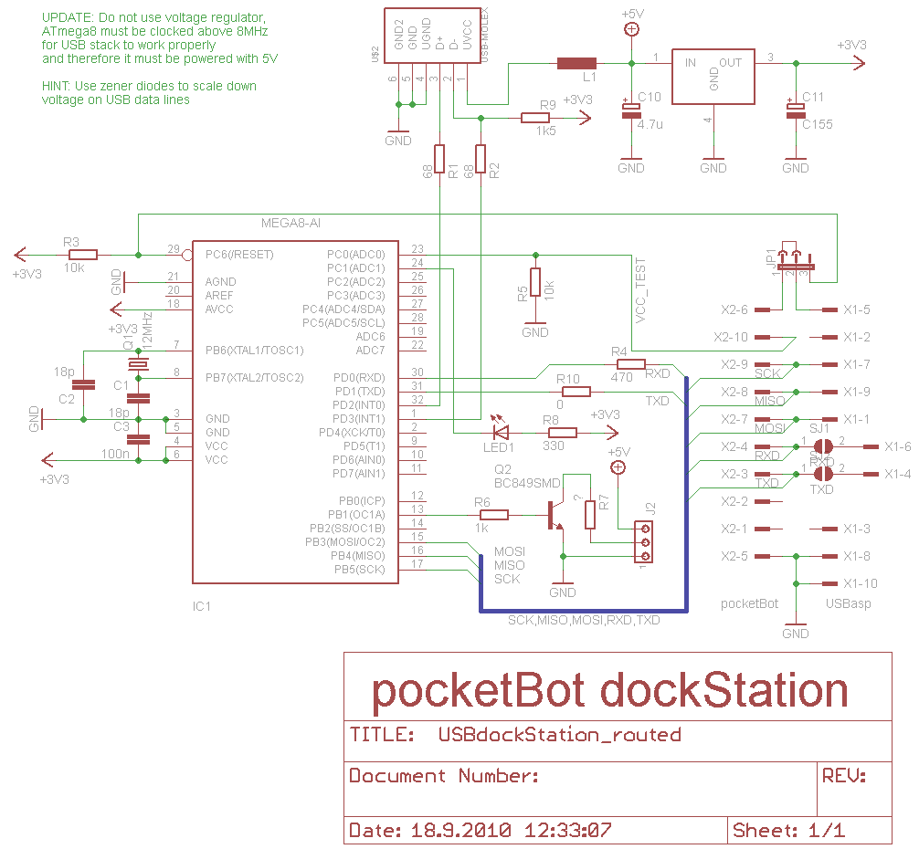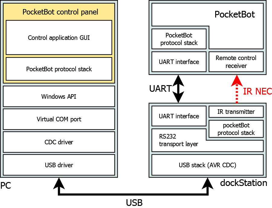 The USB device ensures both wire and wireless communication between the computer and PocketBot. It’s based on an AVR-CDC project, a USB to UART converter. Once the device is connected to a computer, operation system creates a virtual COM port which can be accessed from a computer application. PocketBot, USBdockStation, and the PC application communicate with each other through this UART interface, using a particular protocol that was designed for this purpose.