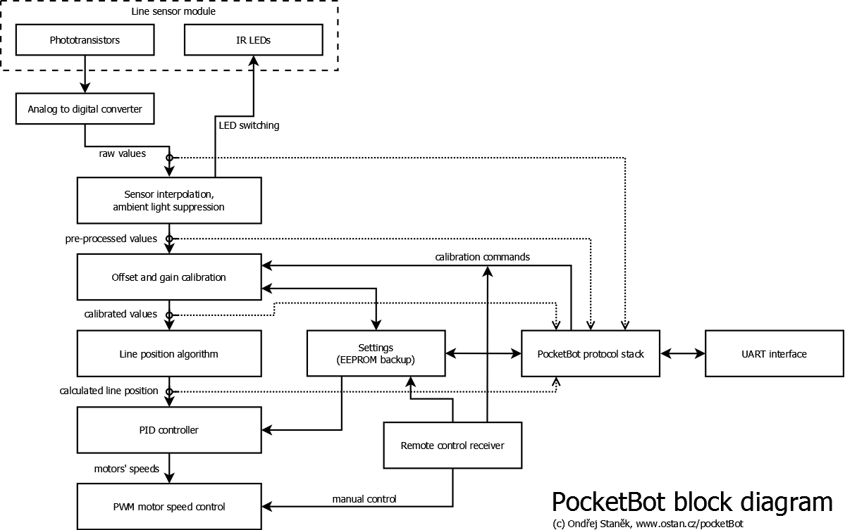 PocketBot project consists of three parts. The key part of the project is the robot itself – a tiny line following vehicle of a matchbox size. Furthermore, the robot is supported with an USB communication device and with a PC control application. Altogether, these three parts form a complex solution to the line following issue.