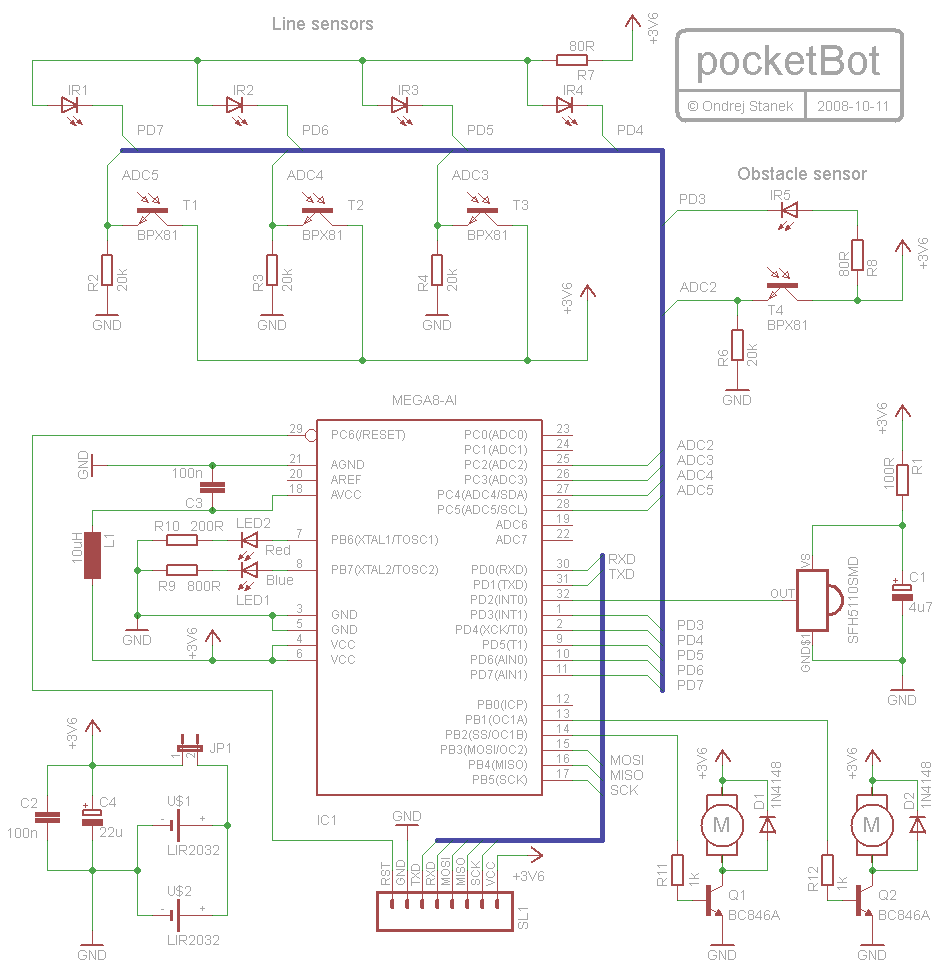 The robot was primary designed to fit into a matchbox. A homemade double-sided printed circuit board stands as the robot’s chassis at the same time. Robot is powered with two rechargeable lithium-ion button batteries wired in parallel (3.6V, 40mAh each). The Atmel ATmega8 microcontroller runs robot’s program, which is written in C. An 8-pin connector offers ISP and UART interface for programming and debugging, respectively.